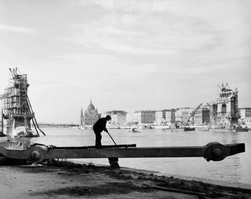A második világháborúban elpusztított Lánchíd újjáépítésén dolgozó munkás, Budapest, 1948